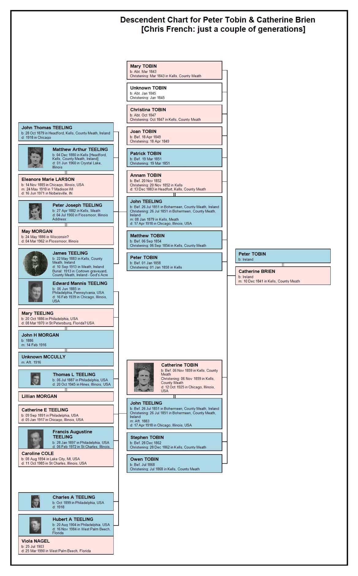 A year and 13 days after arriving in America, Catherine gave birth to Edward Teeling (middle name Mannis added later) on 9th June 1885 in Philadelphia. She and John would go on to have 6 more children. She died on 12th October 1925 and her US death certificate gives her age as '54 years 11 months 12 days' which suggests her date of birth was 31st October 1870 but the same certificate contradicts itself and gives her date of birth as 30th October 1871, These same dates would mean that she was 13 or 14 when she gave birth to Edward. For various reasons, it is not unusual for death certificates to get things wrong. Catherine was the Tobins' 9th child and was baptised on 6th November 1859, so she was in fact 24. A couple of generations of John Teeling & the Tobin sisters can be found here..